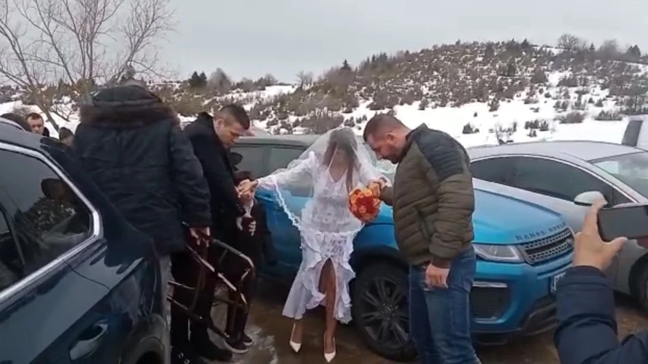Mladenci su na venčanje krenuli iz etno sela u kojem su odseli, a Jelena Đuričanin na sebi ima belu čipkanu venčanicu sa dubokim šlicem i visokim štiklama, dok na glavi nosi veo, a Sloba je odabrao klasično crno odelo.