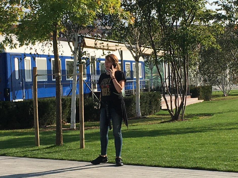 Naš paparaco uslikao ju je u parku u „Beogradu na vodi“ gde stanuje dok razgovara na telefon, a u prvi mah gotovo da je nismo prepoznali.