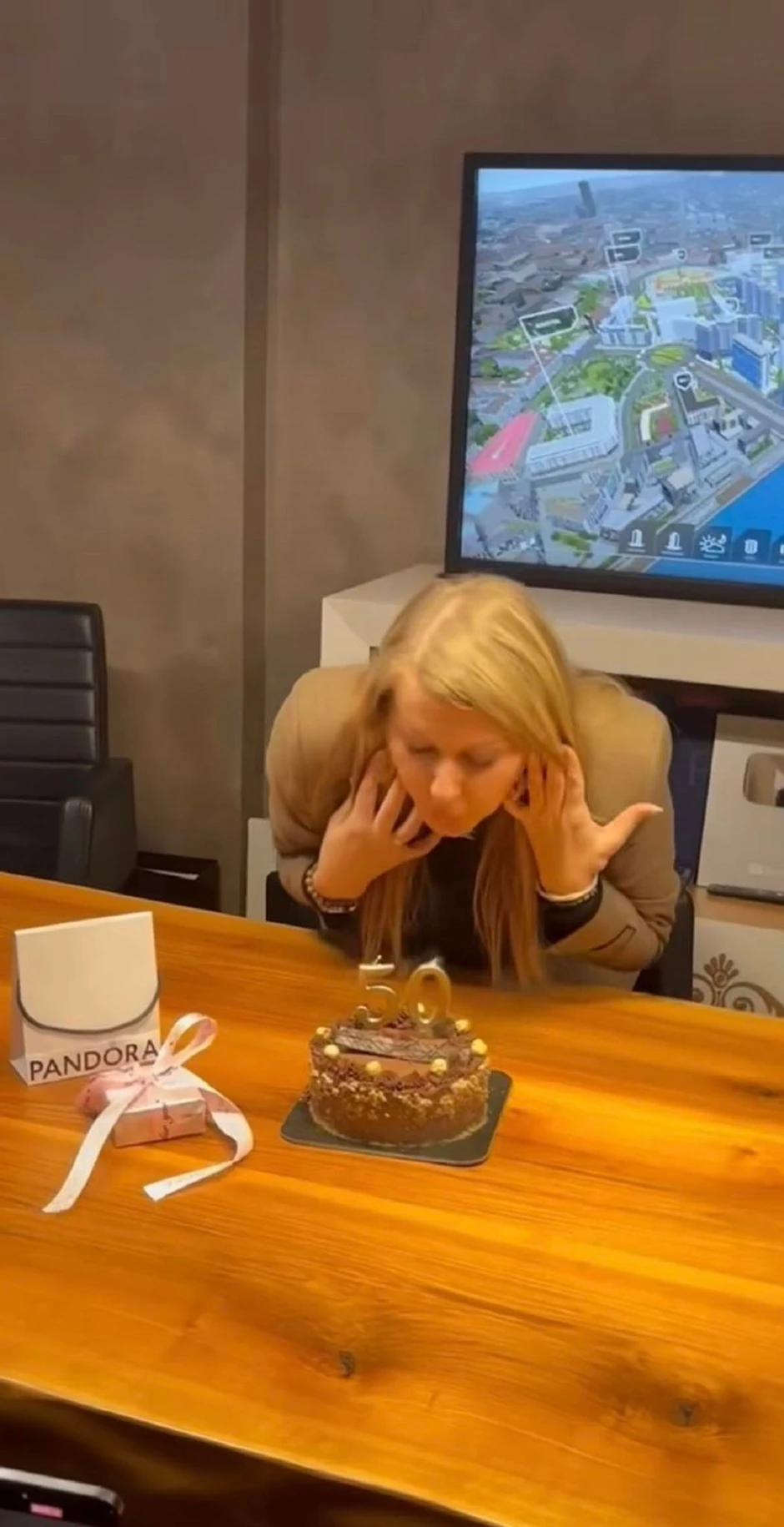 U poslovnom prostoru koji Viki poseduje, dočekali su je sa tortom na kojoj su svećice u broju 50, kao i sa ukrasnim kesicama u kojima su se krili pokloni.