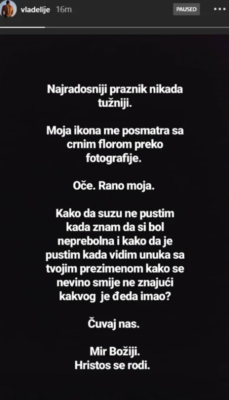 - Najradosniji praznik nikada tužniji. Moja ikona me posmatra sa crnim florom preko fotografije. Oče... Rano moja! Kako da suzu ne postim da si bol neprebolna i kako da je pustim kada vidim unuka sa tvojim prezimenom kako se nevino smeje ne znajući kakvog je dedu imao? Čuvaj nas - poručio je Vladimir putem Instagrama.