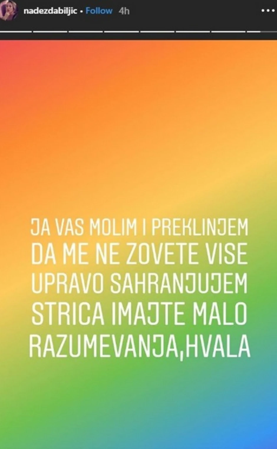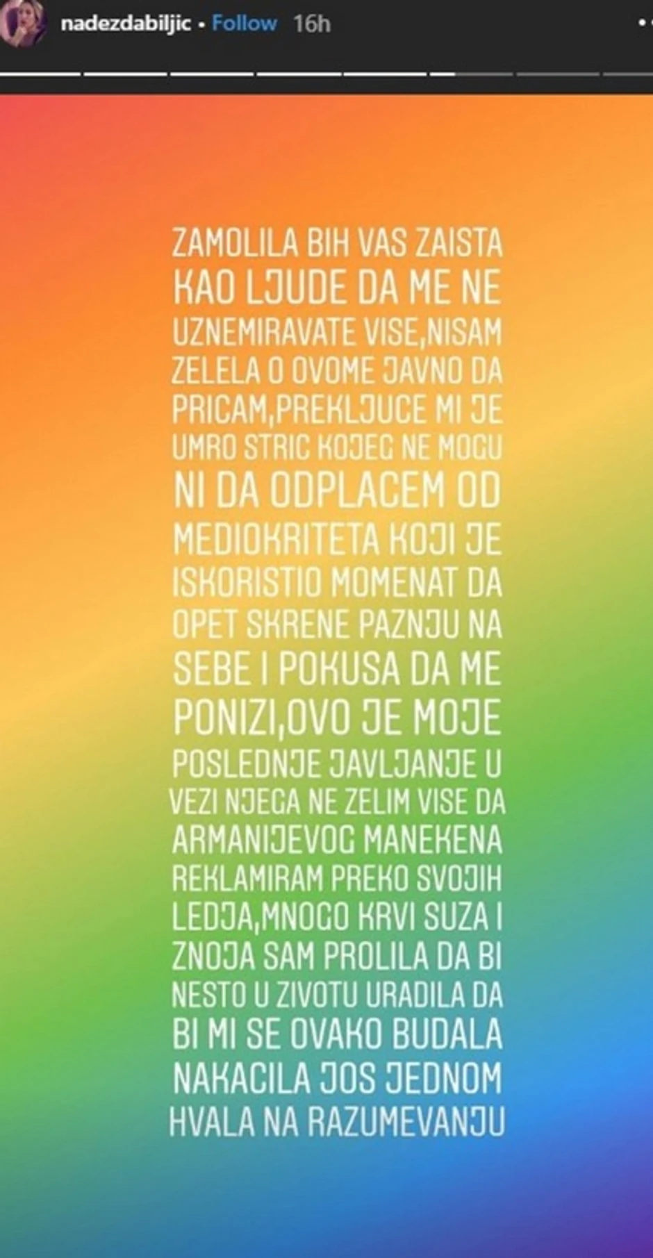 - Zamolila bih vas zaista da me ubuduće ne uznemiravate više, nisam želela o ovome javno da pričam, prekjuče mi je umro stric kojeg ne mogu ni da otplačem od mediokriteta koji je iskoristio momenat da opet skrene pažnju na sebe i pokuša da me ponizi. Ovo je moje poslednje javljanje u vezi njega, ne želim više da manekena reklamiram preko svojih leđa, mnogo krvi, suza i znoja sam prolila da bih nešto u životu uradila, da bi mi se budala ovako nakačila. Hvala na razumevanju - napisala je Nadežda.