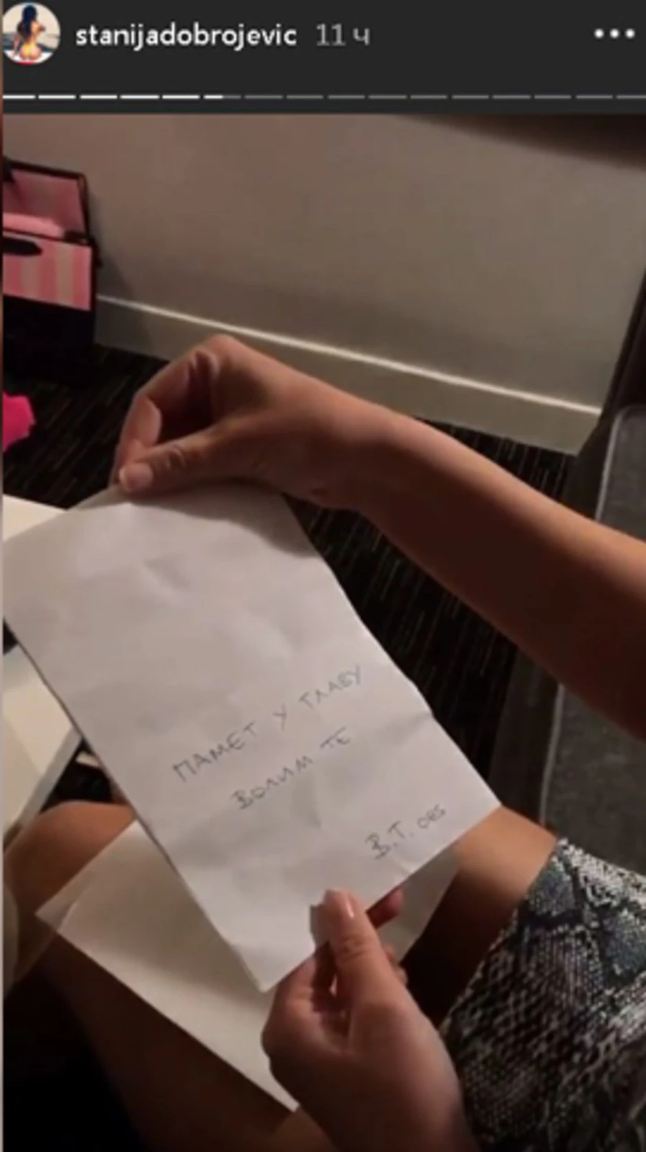 - Pamet u glavu. Volim te - pisalo je na poruci koju je Stanija dobila i koja je potpisana sa inicijalima V.T. i brojevima 085, što je nekadašnji pozivni broj za Bar, u kojem Vladimir Tomović živi.
