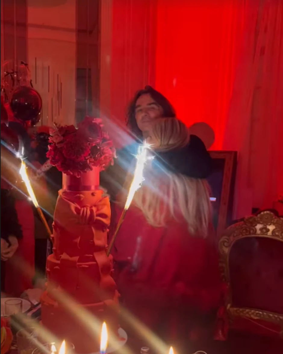 Torta je bila na pet spratova, crvene boje i sa ružama na vrhu, a kada je duvala svećice, Željko Mitrović je sve vreme bio pored nje, a u jednom trenutku ju je čvrsto zagrlio.