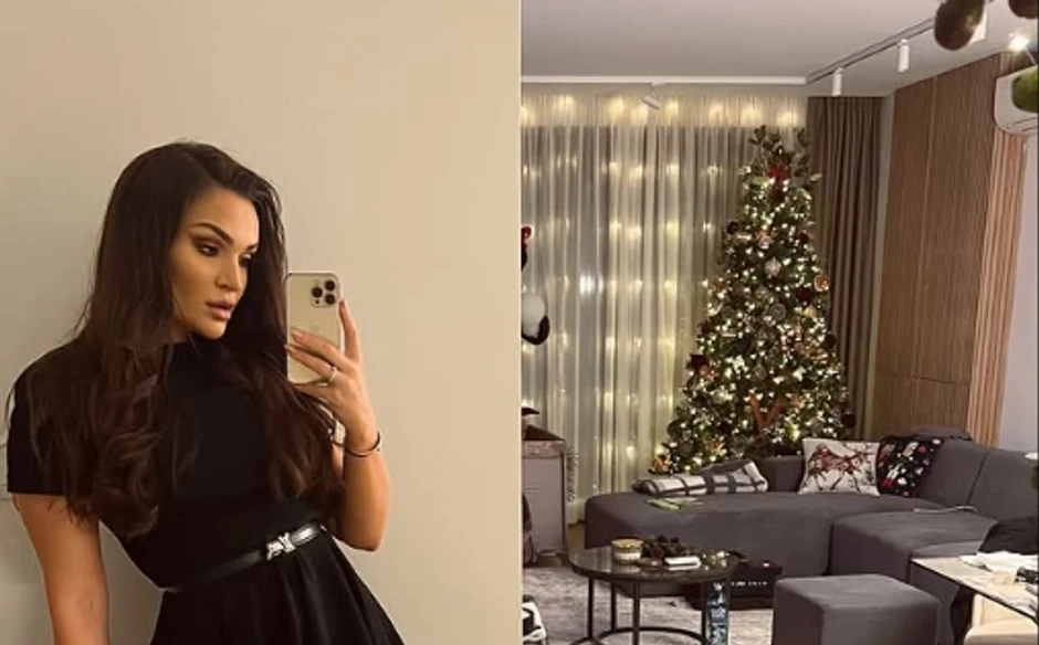 Ogromna jelka se nalazi u dnevnoj sobi, a prepuna je ukrasa kao i lampica. Na sivoj ugaonoj garnituri se nalaze jastuci sa slikom irvasa što je dodatno upotpunilo novogodišnju atmosferu, a i ogledalo je ukrašeno jelkicama.