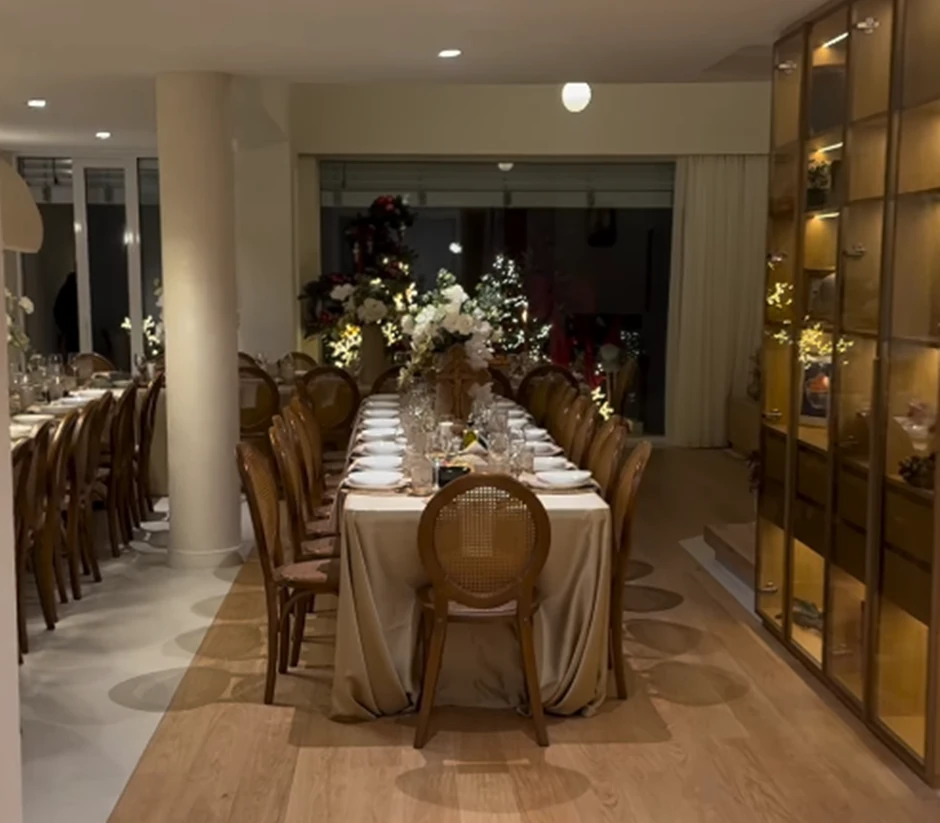 Na samom ulazu je ogromna jelka sa crvenom mašnom i različitim figurama. Nekoliko stolova je bilo spojeno kako bi sa svojim najmilijima slavili slavu.