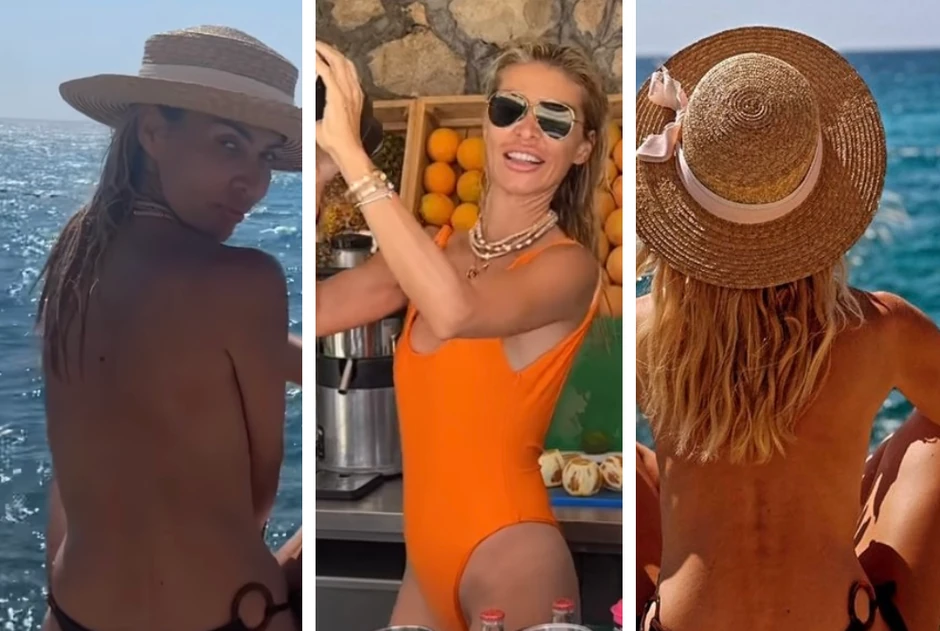 Zadnjicu je istakla u minijaturnom donjem delu kupaćeg kostima, a na glavi je imala šešir.