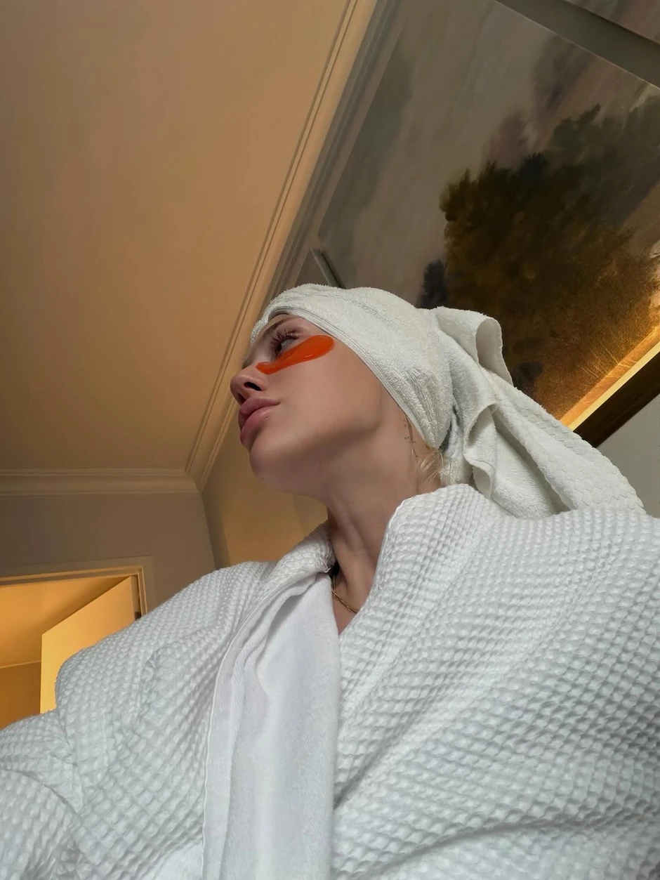 Ona je podelila i selfi iz lifta pokazujući crni elegantni autfit za koji se odlučila, a najveću pažnju je ipak privukao selfi iz hotelske sobe gde je pozirala samo u bademantilu sa maskom ispod očiju.