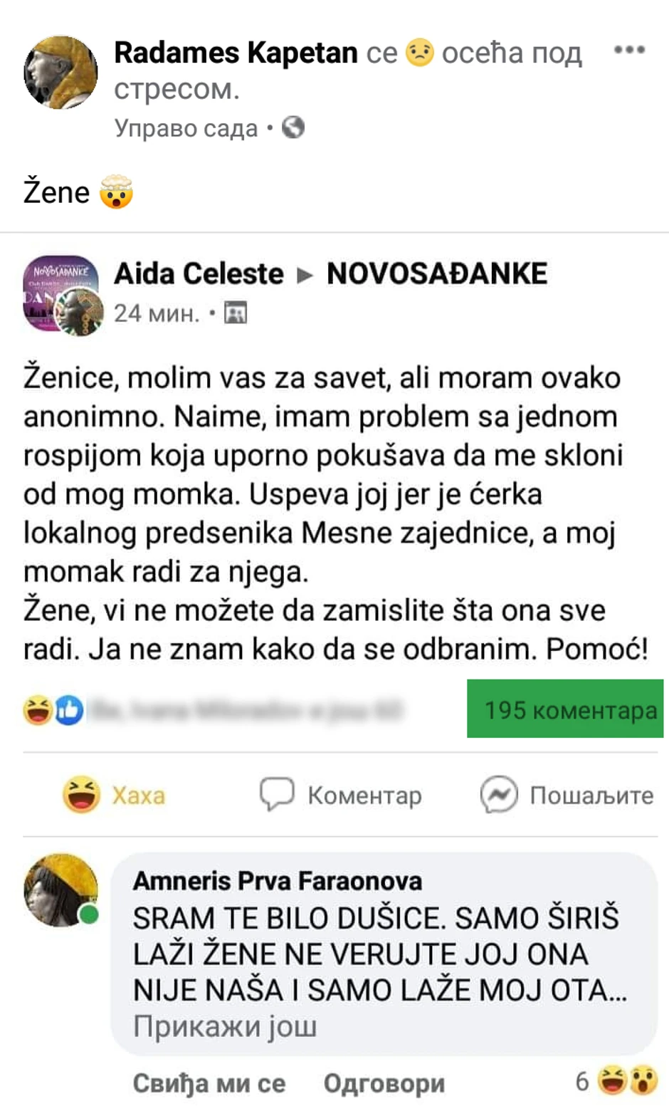 - Ženice, molim vas za savet, ali moram ovako anonimno. Naime, imam problem sa jednom rospijom koja uporno pokušava da me skloni od mog momka. Uspeva joj, jer je ćerka lokalnog predsednika Mesne zajednice, a moj momak radi za njega. Žene, vi ne možete da zamislite šta ona sve radi. Ja ne znam kako da se odbranim. Pomoć – napisala je Aida u Fejsbuk grupi “Novosađanke”.