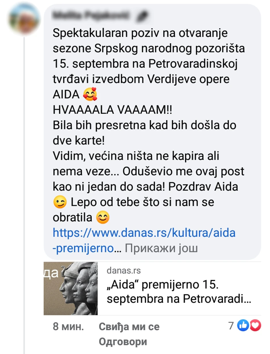 - Prvo smo napravili naloge, pa su danima ljudi dobijali čudne zahteve za prijateljstvo od Radamesa, Aide i Amneris I mogli da prate njihove međusobne odnose, naravno, prevedene u komunikaciju medija koji smo koristili – objašnjava nam Ivana Miloradov, saradnica Opere Srpskog narodnog pozorišta.