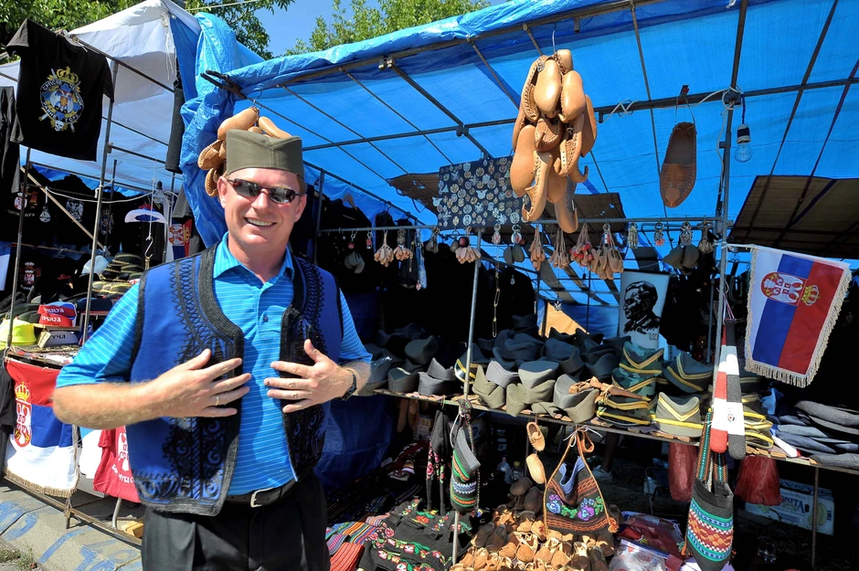 - Moj deda je ovde dolazio kočijom sa konjskom zapregom, a ja, evo, helikopterom - priča nam Žika Amerikanac, dok na tezgi kupuje šajkaču, jelek i srpsku zastavu.