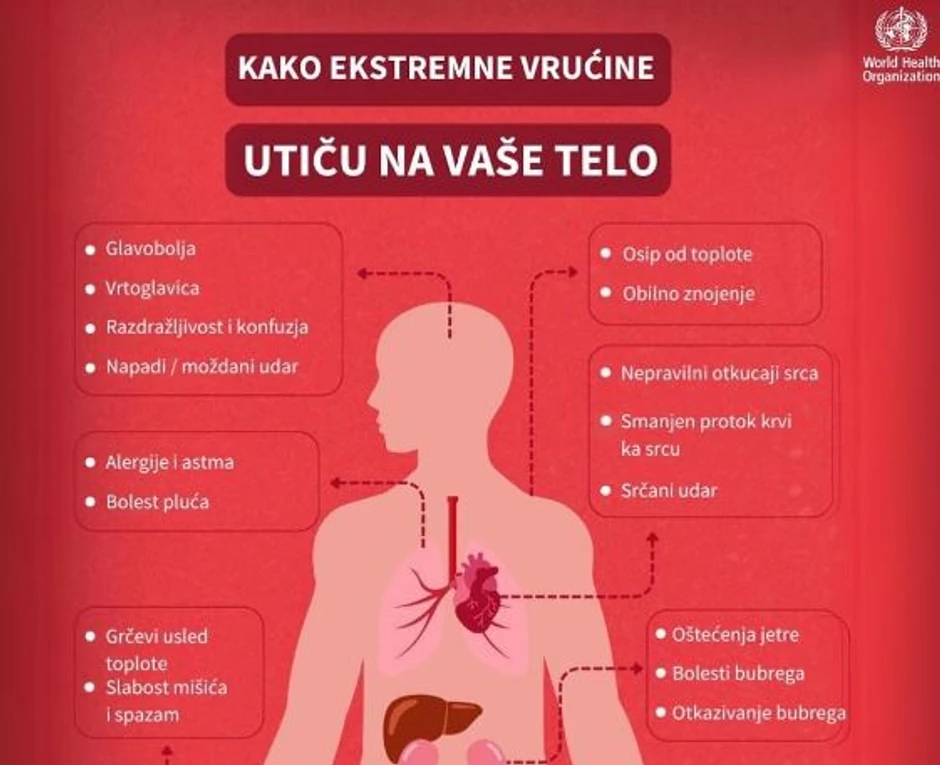 Tropske vrućine su vodeći uzrok smrtnosti koja je direktno povezana sa vremenom i mogu da pogoršaju osnovne bolesti, objavila je Svetska zdravstvena organizacija (SZO), uz objašnjenje na koje delove tela utiče ekstremna vrućina.