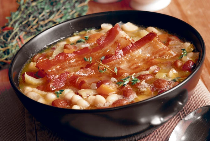 400 g pasulja, 1 glavica crnog luka, 200 g suve slanine, 1 šargarepa, 2 lista lovora, so, biber, 1 kašika mlevene crvene paprike, 1 kašika brašna.