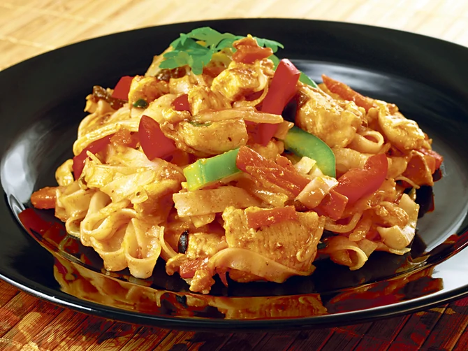 Iseckajte luk, meso i papriku na male kockice. Paradajz prelijte kipućom vodom i ostavite da stoji malo kako bi se lakše skinula kora. U tiganj stavite luk da se prži sa malo ulja, pa dodajte meso. Oljuštite paradajz, iseckajte ga na kockice i sa paprikom dodajte u tiganj kad meso dobije lepu belu boju. Začinite po ukusu. Kada je paradajz pustio vodu, dodajte taranu i kuvajte dok testenina ne omekša.