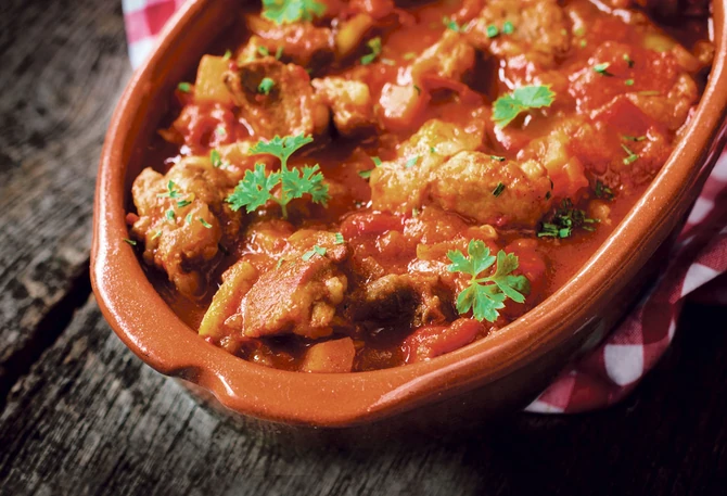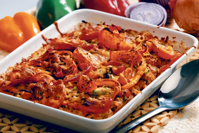 500 g pilećeg belog mesa, 2 glavice crnog luka, 3 paprike, 700 g paradajza, 200 g tarane, malo ulja, po ukusu začini.