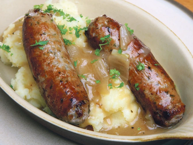 U dubljem tiganju u ulju ispržite kobasice. Izvadite kobasice i u tiganj sitno naseckajte beli i crni luk. Luk upržite i nakon toga ga prelijte belim vinom i krčkajte na tihoj vatri dok ne smekša. Nakon što luk omekša vratite kobasice u tiganj i ostavite ih na tihoj vatri oko 10 minuta. Servirajte uz pire krompir.