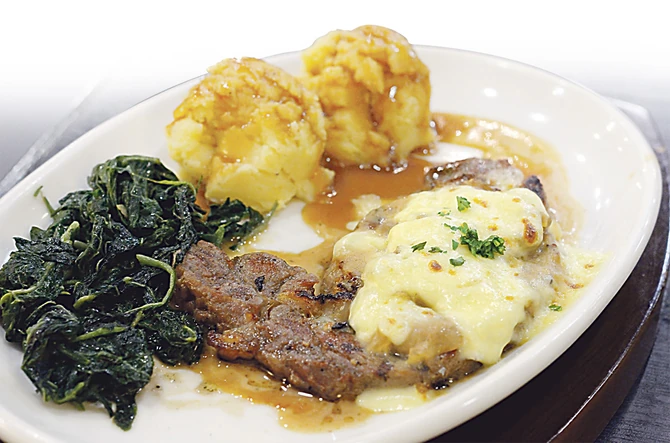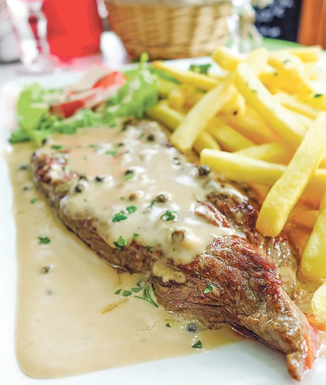 Ceo komad bifteka posolite, pobiberite i začinite začinskim biljem po želji (mirođija, bosiljak, majčina, dušica...) i stavite u tiganj sa zagrejanim uljem, pa propržite sa svih strana da dobije koricu i finu braon boju. Stavite u pleh ili vatrostalnu posudu, prekrijte folijom i pecite na tihoj vatri oko sat vremena. Kada je biftek gotov izvadite ga iz pleha i tečnost koju je meso pustilo tokom pečenja stavite u tiganj, pustite da provri pa, ako je potrebno, još začinite i dodajte gustin razmućen u malo vode. Na kraju umešajte seckani peršun i po želji kockicu maslaca. Biftek isecite na tanke šnicle i svaku prelijte sosom i ukrasite peršunom. Kao prilog poslužite prženi krompir ili dinstano povrće po želji.