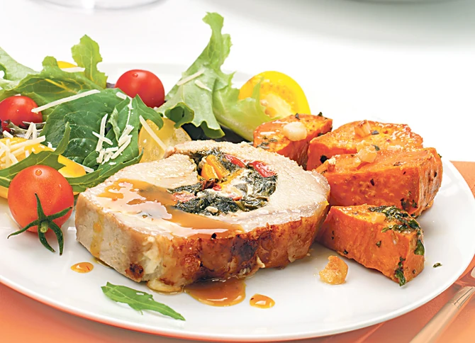 1 kg svinjskog filea, 200 g spanaća, 100 g šargarepe, 100 g sira, 2 čena belog luka, 1 jaje, ulje, so, biber, senf.
